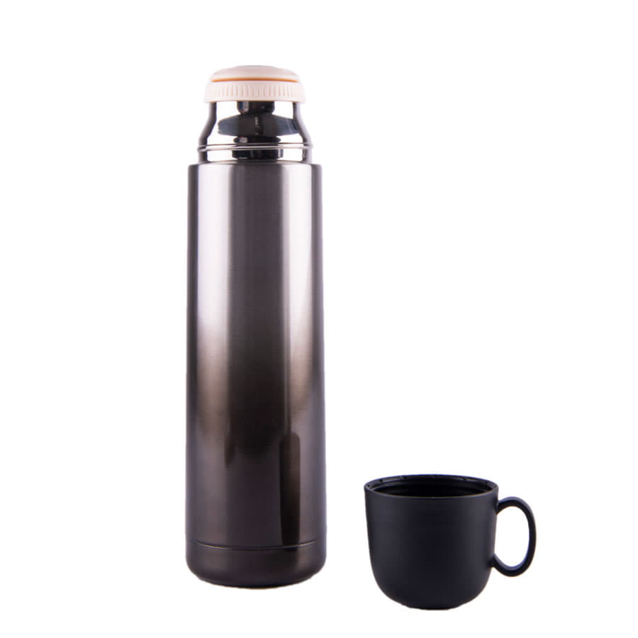 Вакуумный термос Gradient с двойными стальными стенками. Очень удобная форма крышки-чашки. Отделка - плавный градиент из серебряного в угольно-черный цвет. Сохраняет тепло до 12 часов в зависимости от температуры окружающей среды. -