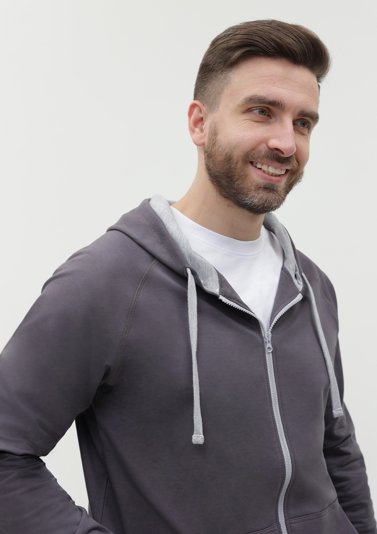 Мужская толстовка прямого силуэта с капюшоном комфортной глубины, рукавом-реглан, глубоким накладным карманом и застежкой на молнию контрастного цвета. Капюшон дополнен шнурком для регулирования прилегания, манжет и низ изделия оформлены широкой эластичной резинкой.