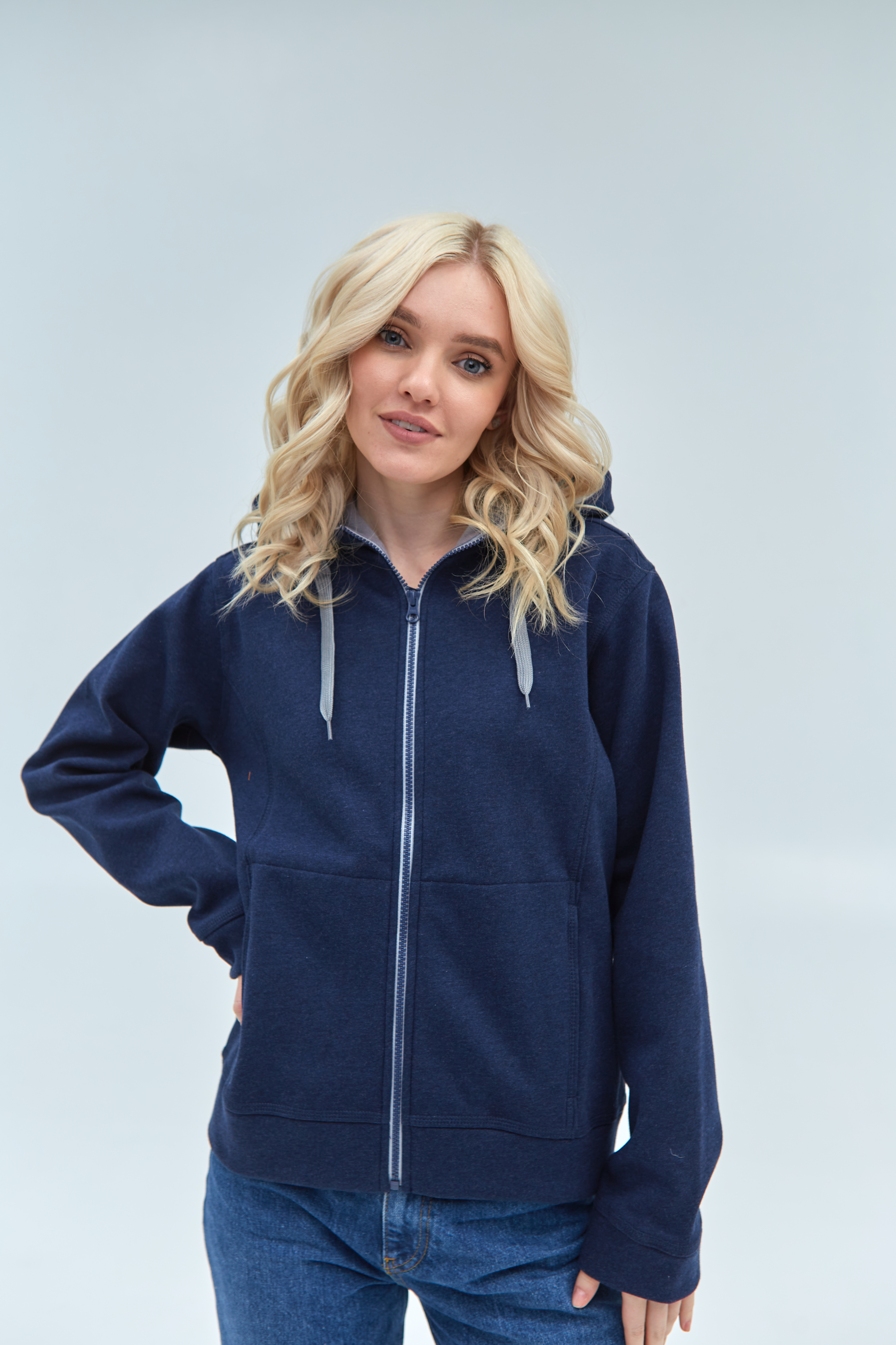 Женская толстовка прямого силуэта с капюшоном комфортной глубины, втачным рукавом, прорезным карманов и застежкой на контрастную молнию. Капюшон дополнен плоским шнурком для регулировки прилегания, манжет и низ изделия выполнены из основного полотна.