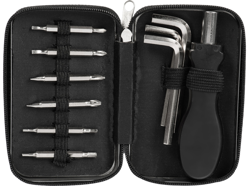 Этот компактный набор содержит 15 инструментов: 3 шестигранных ключа, 6 двухсторонних насадок с битами и ручки к ним. Весь набор компактно упакован в футляр с фиксирующими резинками, которые удерживают инструменты на створках.