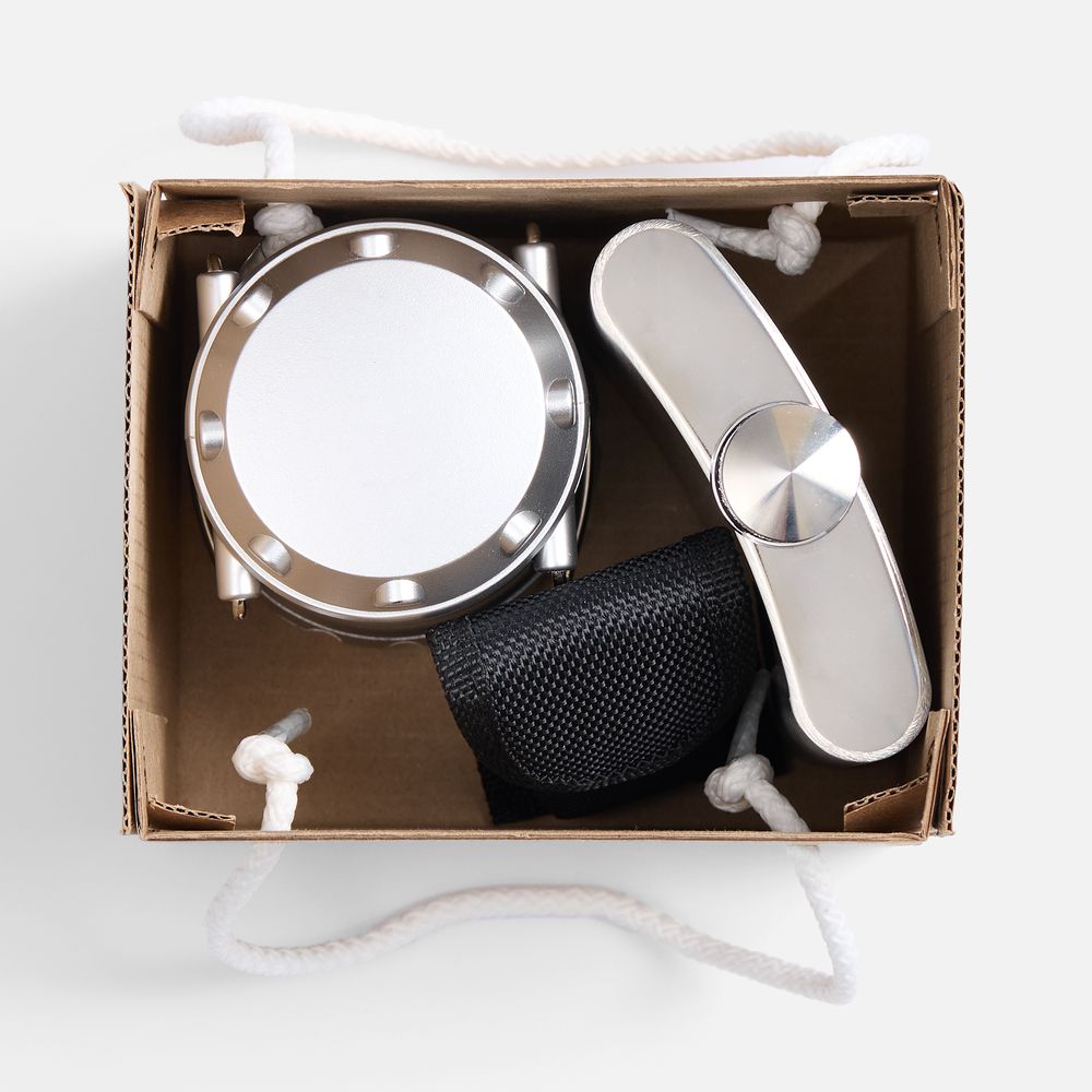 мультитул - нержавеющая сталь; алюминий; фляжка - нержавеющая сталь, 304; фонарь - АБС-пластик; коробка - микрогофрокартон