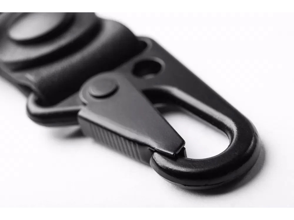 Ремешок сшит из прочной кожи чёрного цвета. Оборудован надёжным металлическим карабином, самопроизвольное расцепление которого невозможно. Ключи, прицепленные к нему, обречены вечно храниться в глубинах сумки или кармана джинсов, и у них нет ни единого шанса потеряться. Прицепить ремешок можно к шлёвке джинсов или к куртке. -