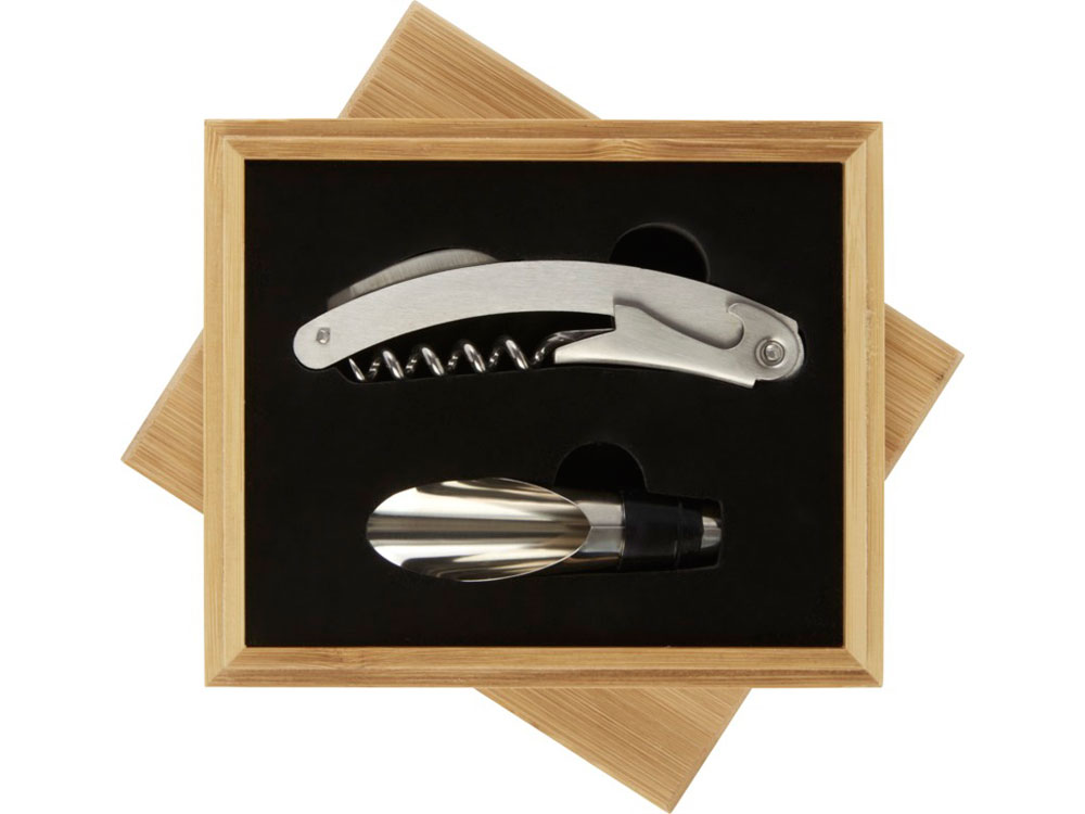 Набор для вина из 2 предметов: штопор официантки и насадка на бутылку. Поставляется в бамбуковой подарочной коробке, изготовленной в соответствии с экологическими стандартами.