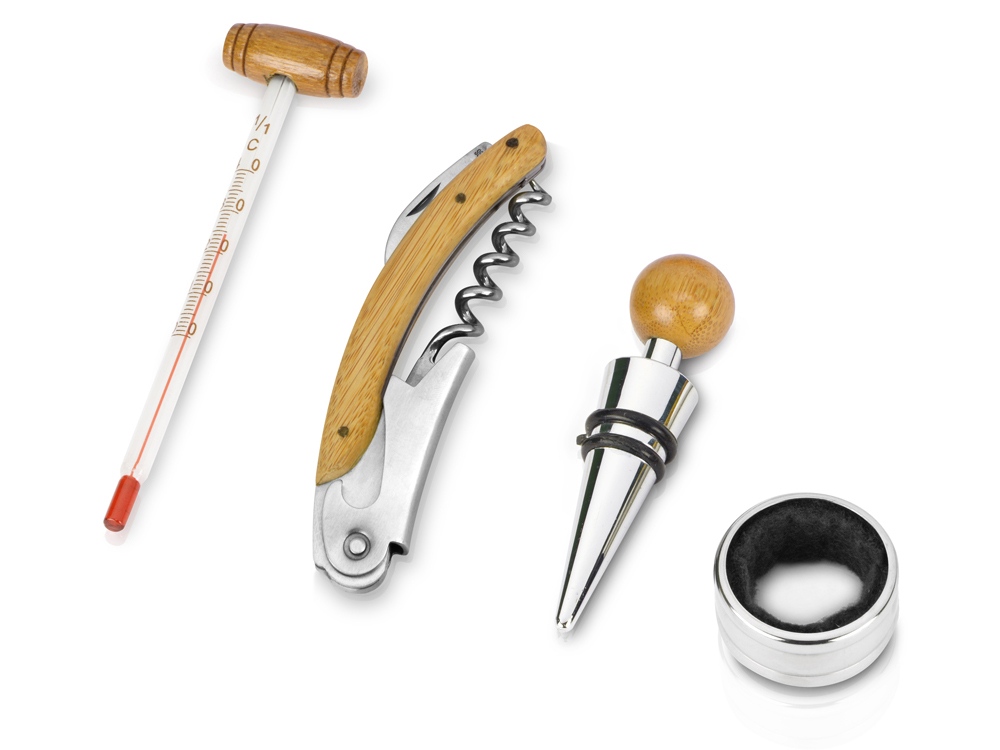 В набор аксессуаров для вина входят штопор-открывалка, воротничок на бутылку, пробка для бутылки и даже термометр. Набор поставляется в презентабельном деревянном футляре. -