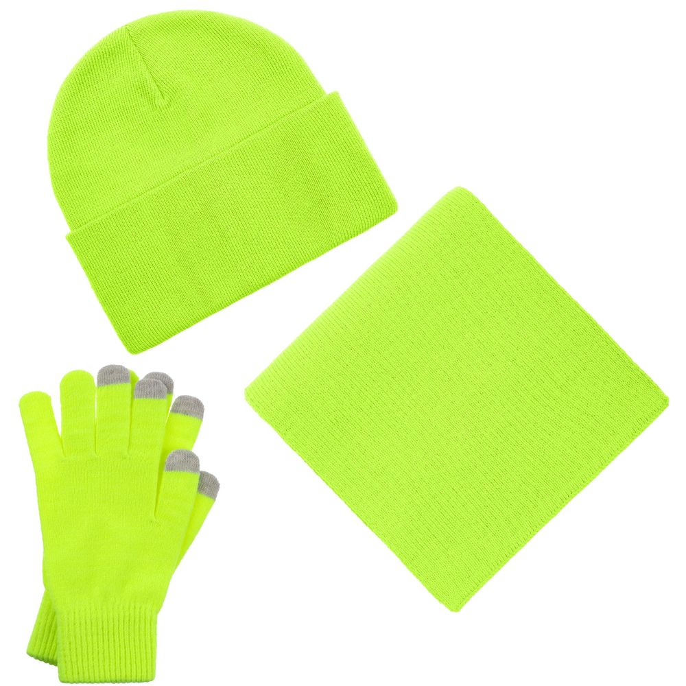В комплект входят двухслойная шапка с регулируемым отворотом и легкий однослойный шарф из мягкой акриловой пряжи, сохраняющие тепло и защищающие от ветра, а также эргономичные перчатки со специальными токопроводящими волокнами на кончиках пальцев, в которых можно свободно пользоваться смартфоном даже в холодную погоду. Универсальная цветовая гамма и лаконичный дизайн делают набор органичным дополнением к любой верхней одежде.