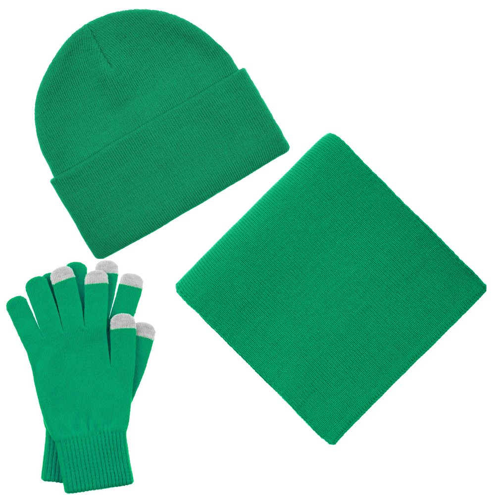 В комплект входят двухслойная шапка с регулируемым отворотом и легкий однослойный шарф из мягкой акриловой пряжи, сохраняющие тепло и защищающие от ветра, а также эргономичные перчатки со специальными токопроводящими волокнами на кончиках пальцев, в которых можно свободно пользоваться смартфоном даже в холодную погоду. Универсальная цветовая гамма и лаконичный дизайн делают набор органичным дополнением к любой верхней одежде.
