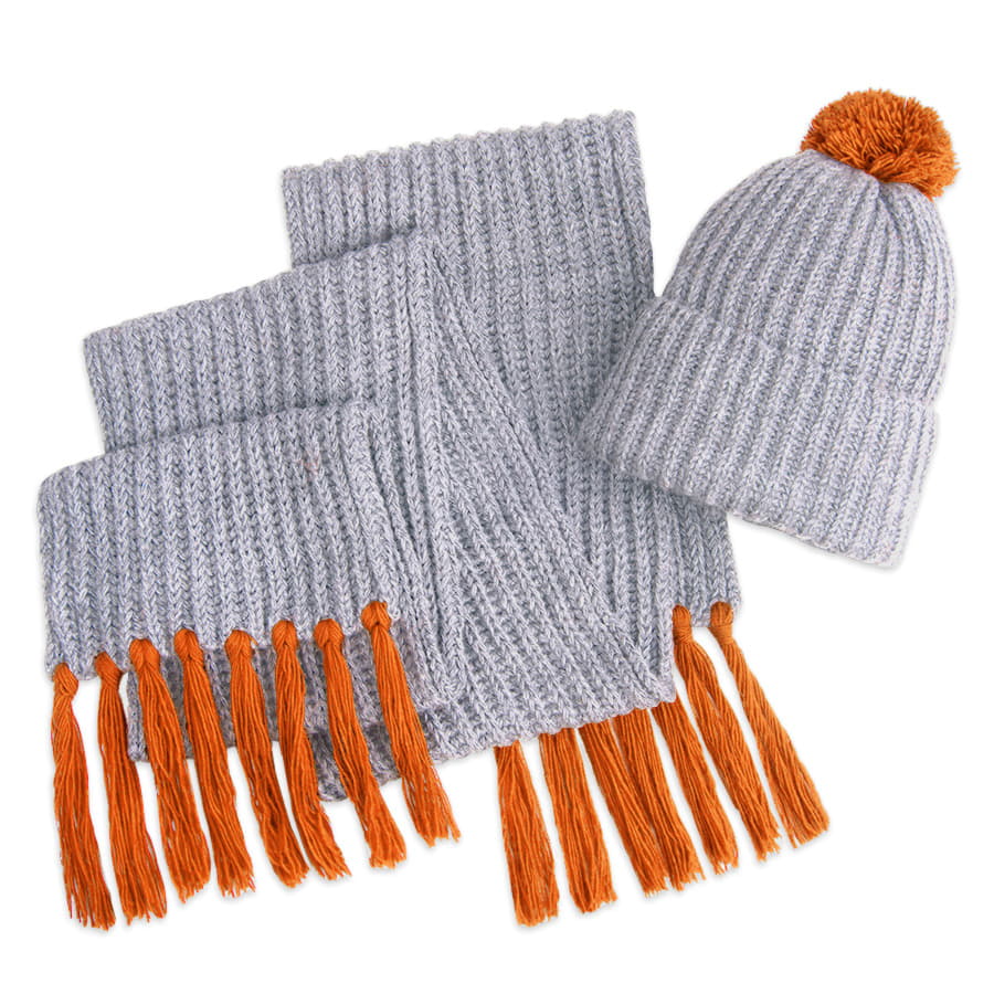 Мягкий, пушистый и уютный комплект из шарфа и шапки поможет согреться вам в холодное время года. Светло-серый цвет нейтрален и очень комфортен в носке.  Благородый серый ассоциируется с компромиссом, спокойствием и стабильностью.  Почувствуйте магическое влияние серого цвета в сочетании с яркой отделкой!Цвет помпона и кисточек близкий к Pantone 166C