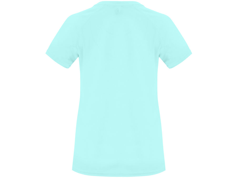 Спортивная футболка с коротким рукавом реглан для женщин. Круглый вырез горловины с отделкой плоским швом. Рукав сложного кроя для обеспечения дополнительного удобства при занятиях спортом. Отделка плоским швом с застилом по пройме и рукавам.