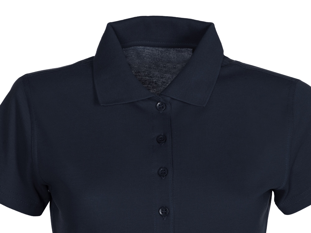 Женская рубашка-поло First. Воротник 1х1. Обшивка внутри воротника. Мужская и детская модели с 2 пуговицами, женская - с 4 пуговицами. Пуговицы с гравировкой в тон. Пике, 100% хлопок. 160 г/м2.
