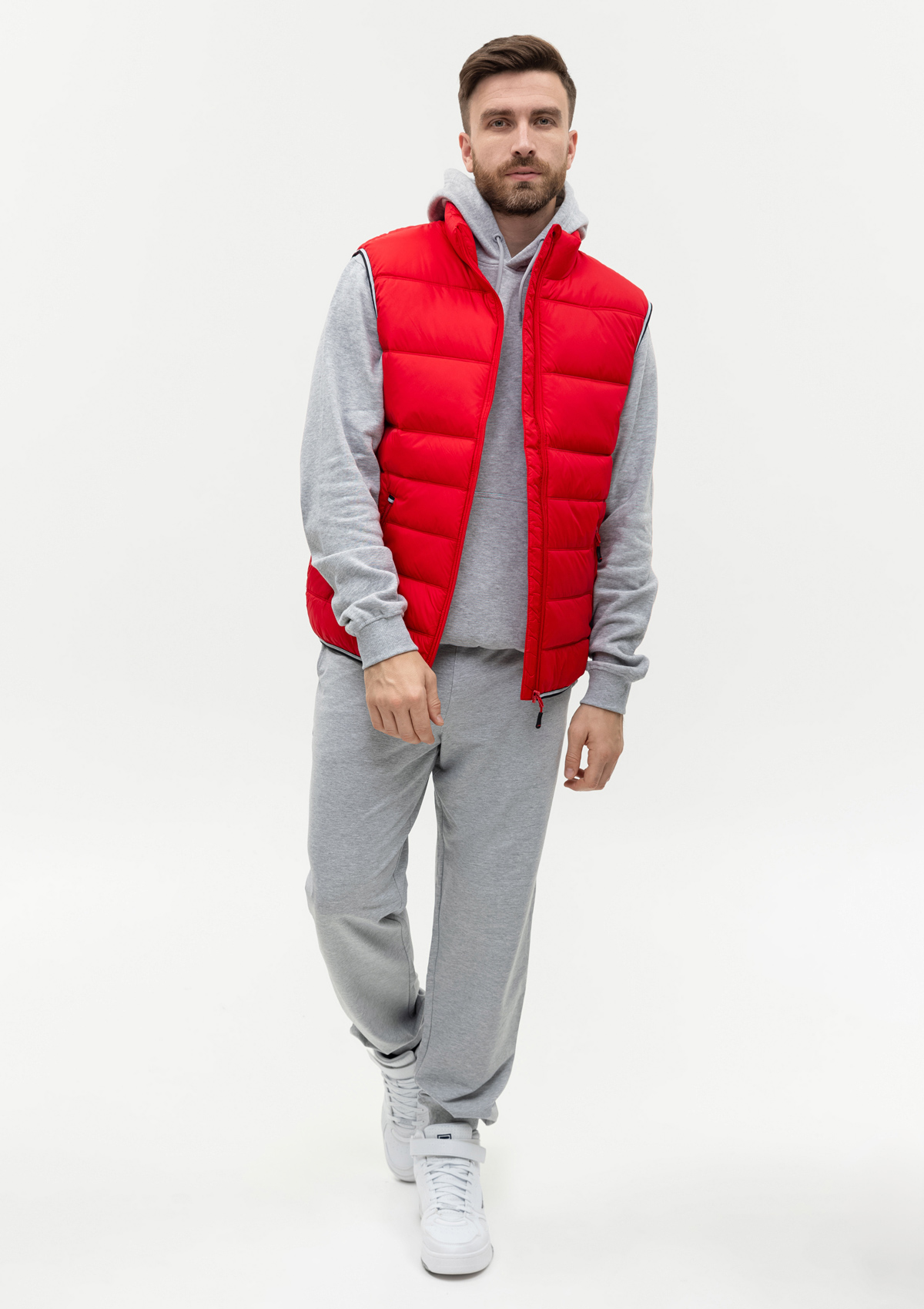 Мужской жилет прямого силуэта с геометричной стежкой, воротником-стойкой, прорезным карманом и застежкой на молнию. Изделие дополнено контрастной резинкой по пройме и линии низа для дополнительной защиты от холода и ветра.