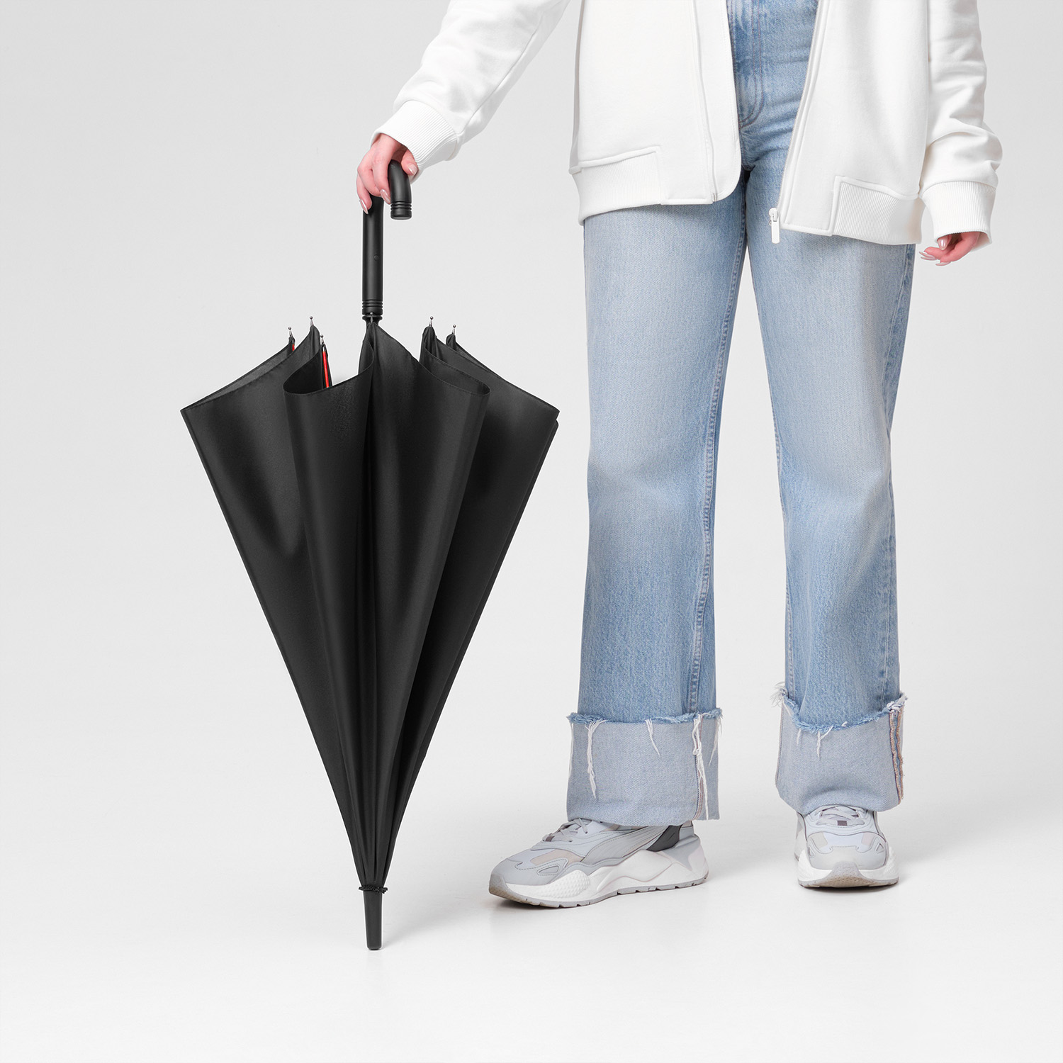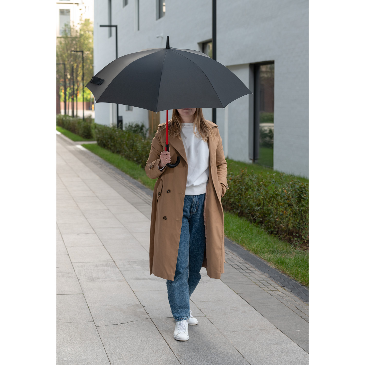 Полуавтоматический зонт быстро раскрывается при нажатии на кнопку. Контрастные цветные спицы окрашены в тон трости и кнопки на ручке. Зонт оснащен гибкими спицами с конструкцией антиветер, которая защищает зонт от поломок при резких порывах ветра. PU-покрытие на ручке зонта обеспечивает комфортное и долговечное использование аксессуара: оно устойчиво к истиранию, не скользит в руке и не становится липким.